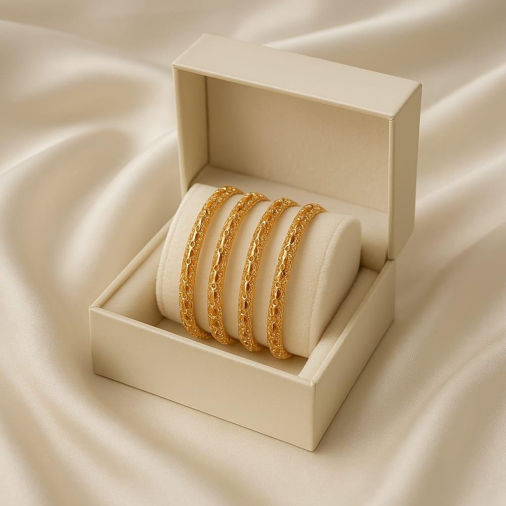 Achieve a timeless look with this stunning 4-piece golden bangle set. Featuring a combination of mesh textures and intricate geometric patterns, these bangles are designed to provide a rich, traditional aesthetic that complements any festive attire.