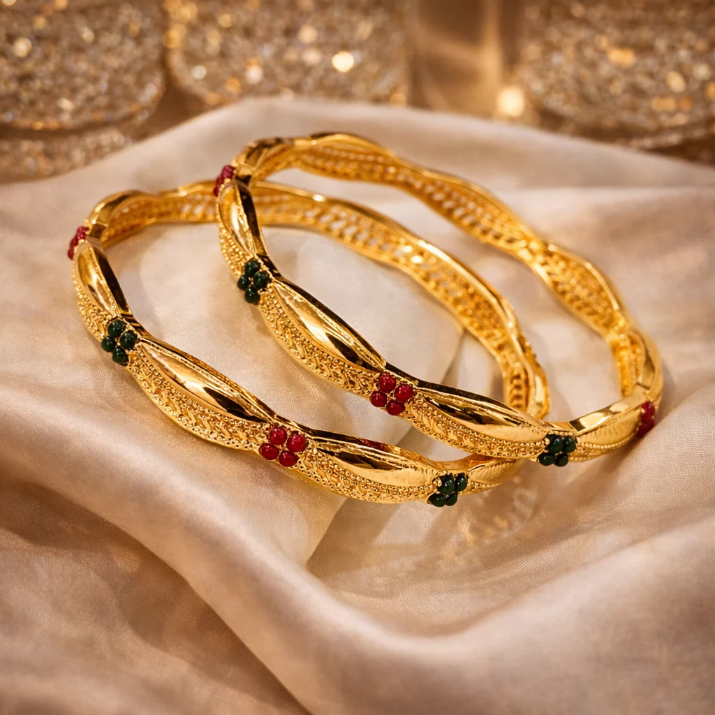 Expertly crafted with a rich gold-plated finish, these karas feature intricate filigree metalwork. The design is highlighted by delicate ruby-red and emerald-green stone embellishments, making it a versatile accessory that pairs perfectly with emerald greens, deep reds, or classic gold ensembles.